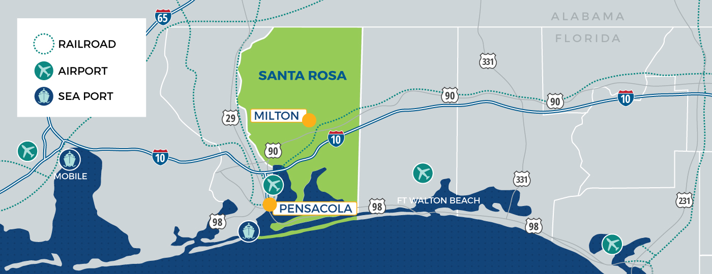 Companies also benefit from the proximity of a commercial airport (Pensacola International Airport), rail service, and three deep-water ports, two of which have foreign trade zone designations.